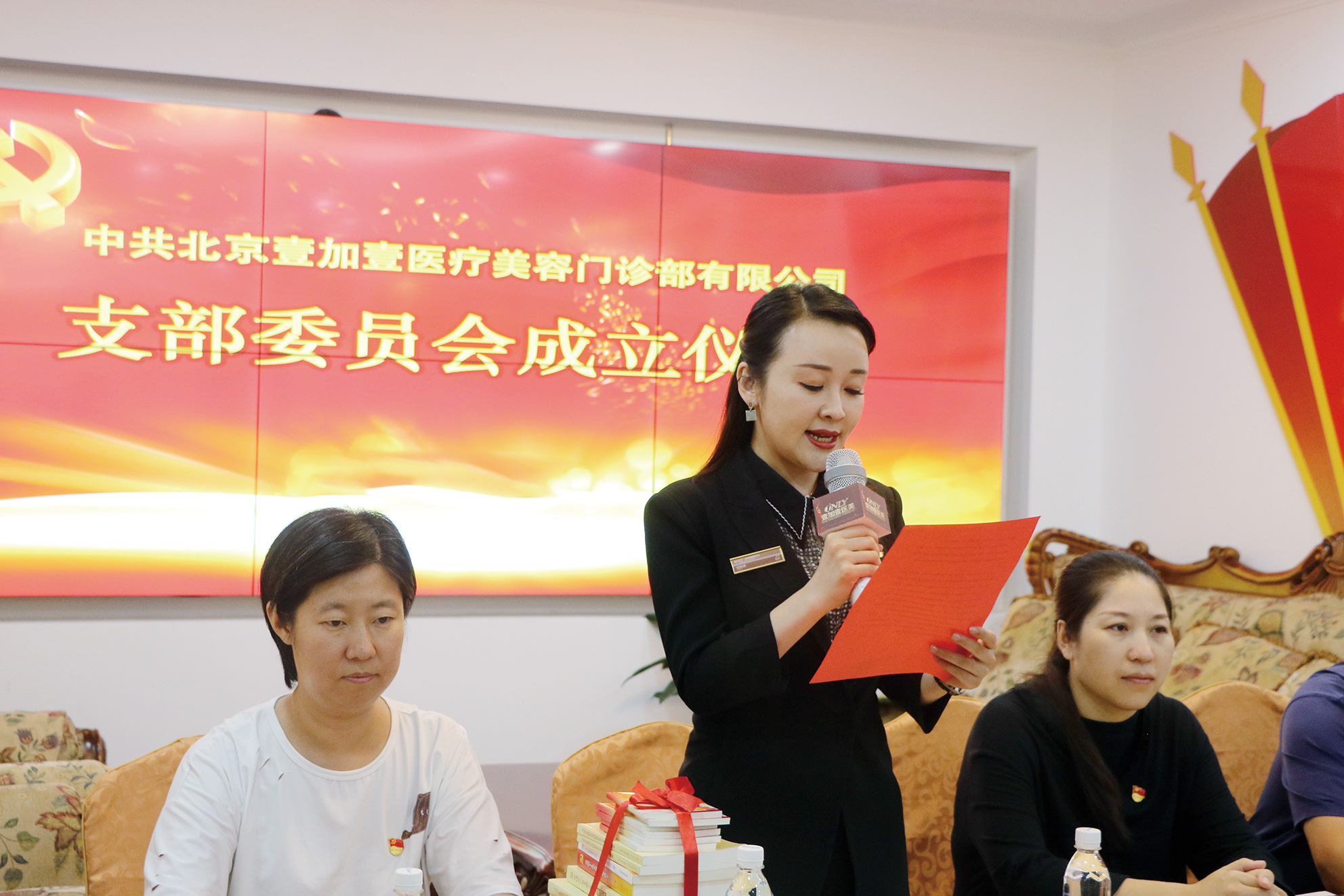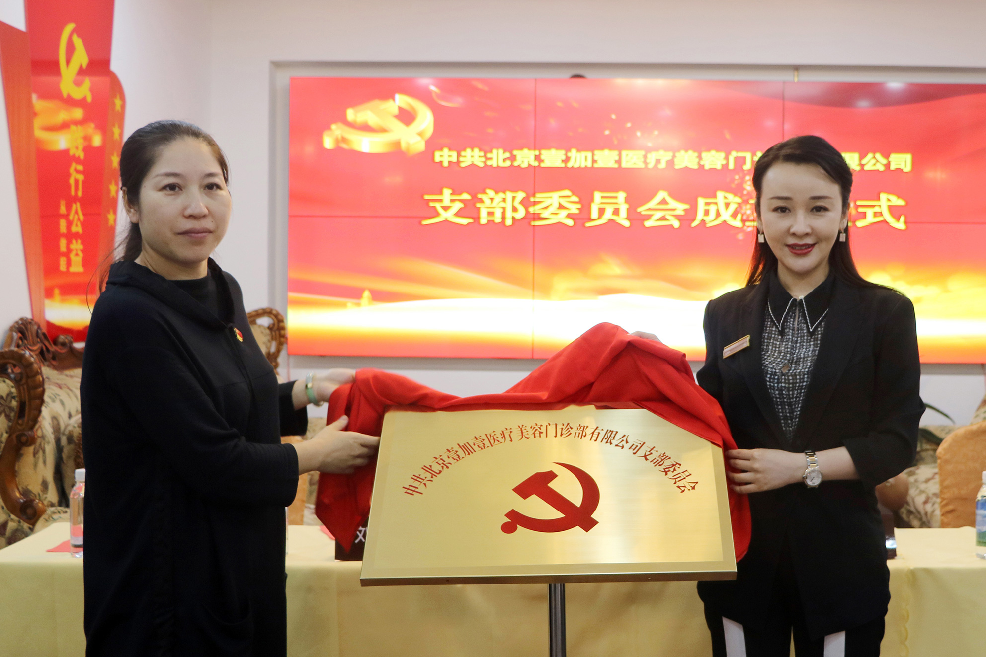 2019年9月18日,中共北京壹加壹医疗美容门诊部有限公司支部委员会成立仪式隆重举行,东直门街道党群工作办公室副主任赵永霞主持仪式。会议在雄壮的国歌声中拉开序幕,东直门街道总工会主席、非公党委书记黄斌宣布北京壹加壹医疗美容门诊部有限公司党支部正式成立,中国整形美容协会技术标准与质量控制部主任、壹加壹医美股份副董事长兼执行总裁刘琳琳被任命为党支部书记。